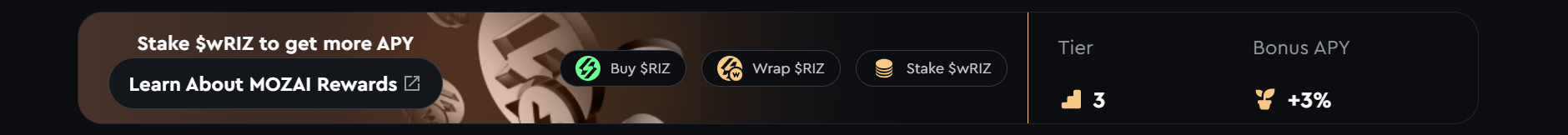zNode holders don’t start from zero. They are automatically placed in Tier 3, unlocking a +3% APY boost in $wRIZ from day one on MOZAI.