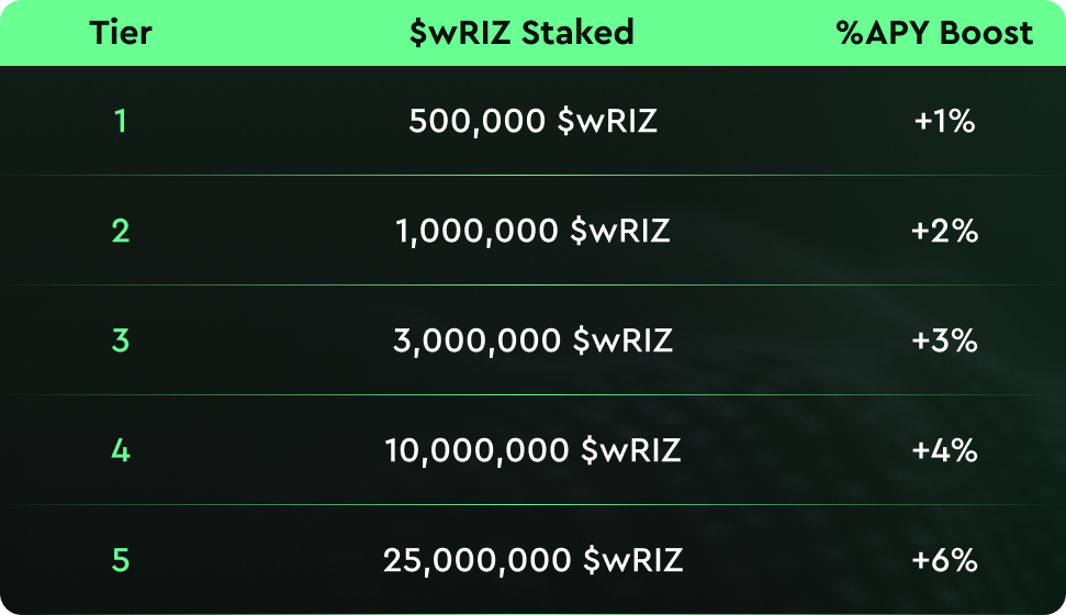 Beyond the base $USDC yield, users can unlock APY boosts paid in $wRIZ by staking $wRIZ and moving up through tiered levels: